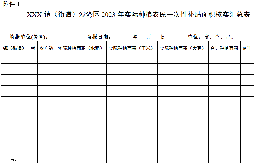 (三)數(shù)據(jù)匯總報送。5月27日前,各鎮(zhèn)(街道)將復(fù)核和公示無異議后的面積統(tǒng)計匯總,經(jīng)主要領(lǐng)導(dǎo)審核簽字上報區(qū)農(nóng)業(yè)農(nóng)村局,區(qū)農(nóng)業(yè)農(nóng)村局匯總?cè)珔^(qū)實際種糧農(nóng)民一次性補貼面積,與區(qū)財政局根據(jù)下達我區(qū)補貼總資金測算出我區(qū)補貼標準。